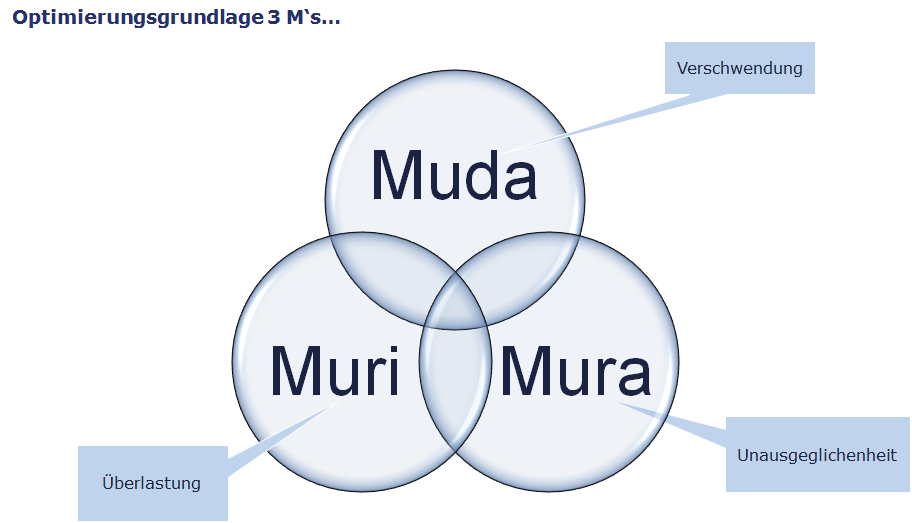 Hinter Muda stehen überflüssige Aktivitäten, die die Durchlaufzeiten verlängern, zusätzliche Handgriffe erfordern, um Teile oder Werkzeuge herbeizuschaffen, zu Lagerüberhängen führen oder Leerlauf- und Wartezeiten verursachen. Muda ist das Ergebnis von Mura.