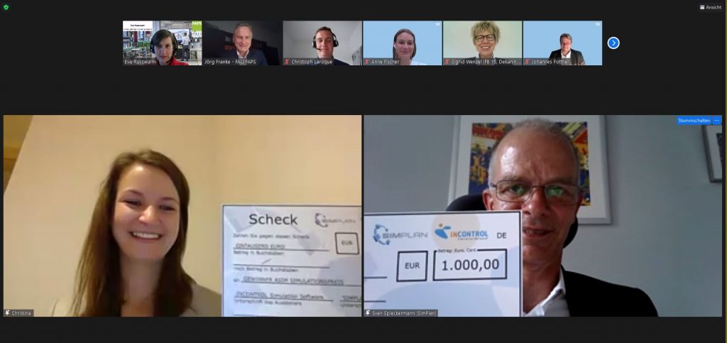 Dass die Beiträge von hohem qualitativen Wert waren, zeigten auch die vielen Fragen und Diskussionsbeiträge im Anschluss. So wurden zwei Beiträge jeweils mit einem Best-Paper-Award für den besten Beitrag aus Industrie und Forschung ausgezeichnet. Über den Preis für den besten industriellen Beitrag freuten sich Mitarbeiterinnen und Mitarbeiter der Robert Bosch GmbH um Dr. Sarah Sitz und Forscher des Lehrstuhls FAPS um Tobias Lechler für ihr Paper mit dem Titel „Einsatz der ereignisdiskreten Materialflusssimulation bei Methoden aus der kontinuierlichen Verbesserung im Fertigungsumfeld: Erfolg und Auswirkungen der Speedweek 4.0“. Der Preis für das beste wissenschaftliche Paper wurde an Leonard Overbeck vom KIT für den Beitrag “Kontinuierliche Validierung und Aktualisierung für hohe Realitätsnähe von Digitalen Zwillingen von Produktionssystemen” verliehen. Wir wünschen herzlichen Glückwunsch und viel Erfolg bei der Umsetzung und Weiterentwicklung der Forschungsergebnisse.